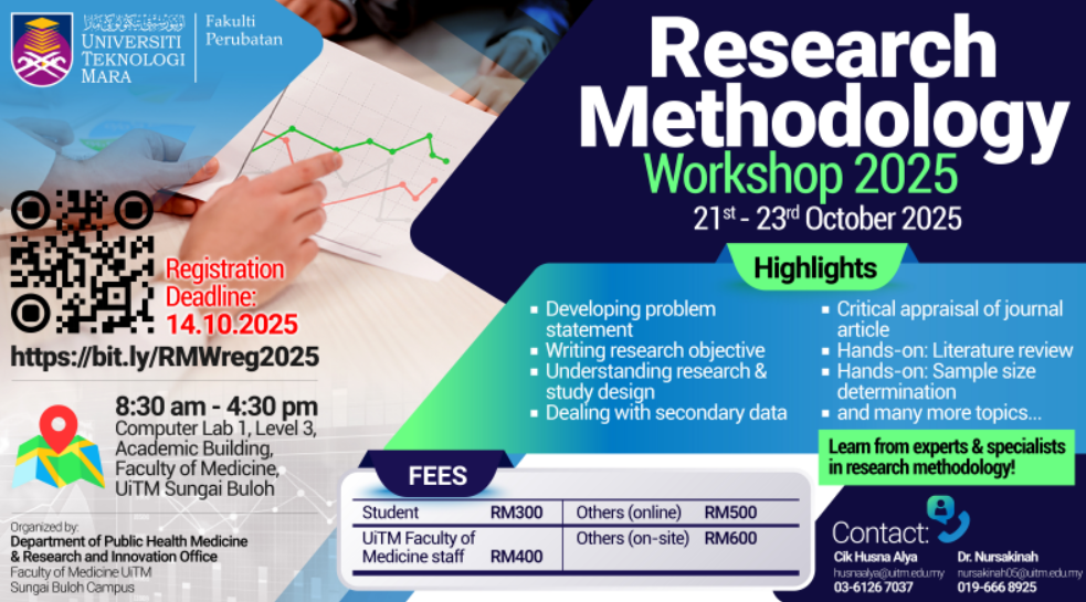 The Office of Deputy Dean (Research & Innovation) collaborates with the Department of Public Health Medicine to offers advice and guidance in preparing constructive research proposals for postgraduates’ students, researchers as well as lecturers. Apart from Biostatistics Consultancy Service, we have conducted Research Methodology Workshop annually since 2019. The workshop will expose participants to various aspects of research methodology in medicine, and to equip the participants with essential knowledge and basic skill towards developing research proposals in medical research.