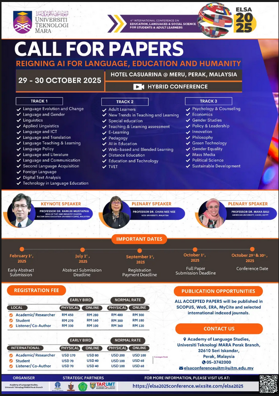 Konferens ELSA 2025 merupakan platform yang sesuai bagi para penyelidik, pendidik, dan pelajar untuk bertukar idea, membentangkan hasil kajian, serta meneroka masa depan pendidikan dan bahasa dalam era kecerdasan buatan.